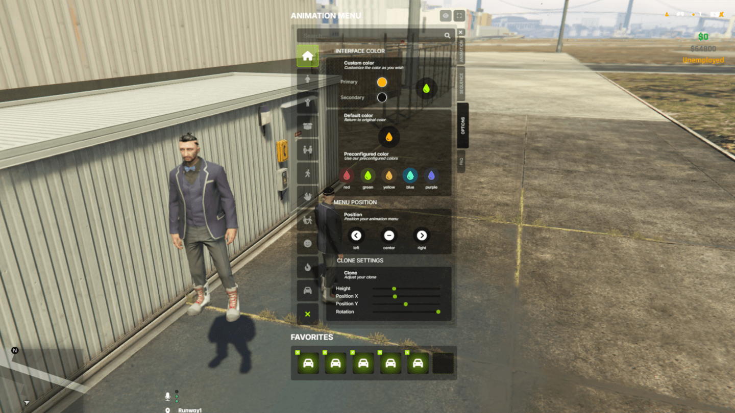 A fully customizable interface allowing players to adjust menu colors, layout, and clone preview settings. Includes real-time sliders and predefined themes for a personalized experience.