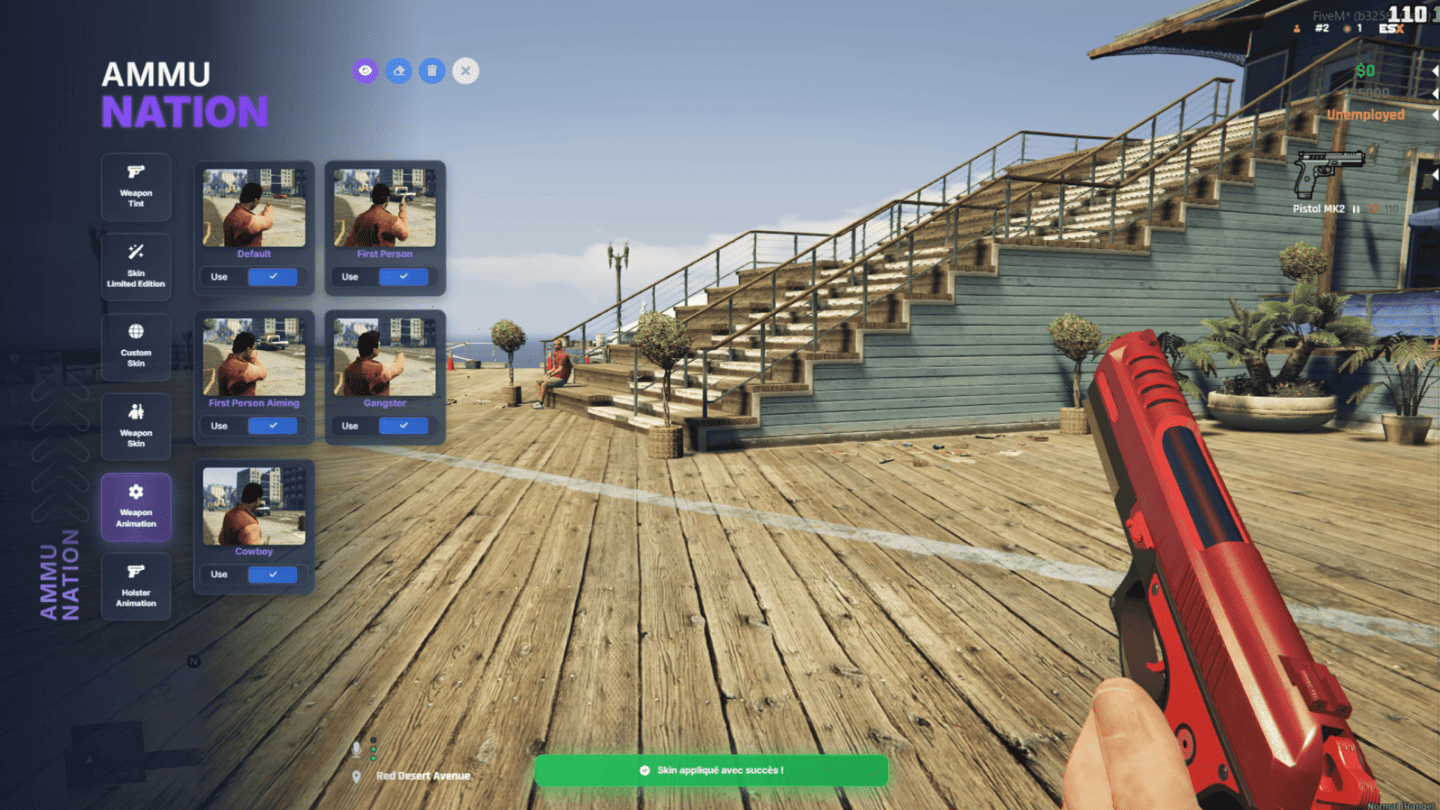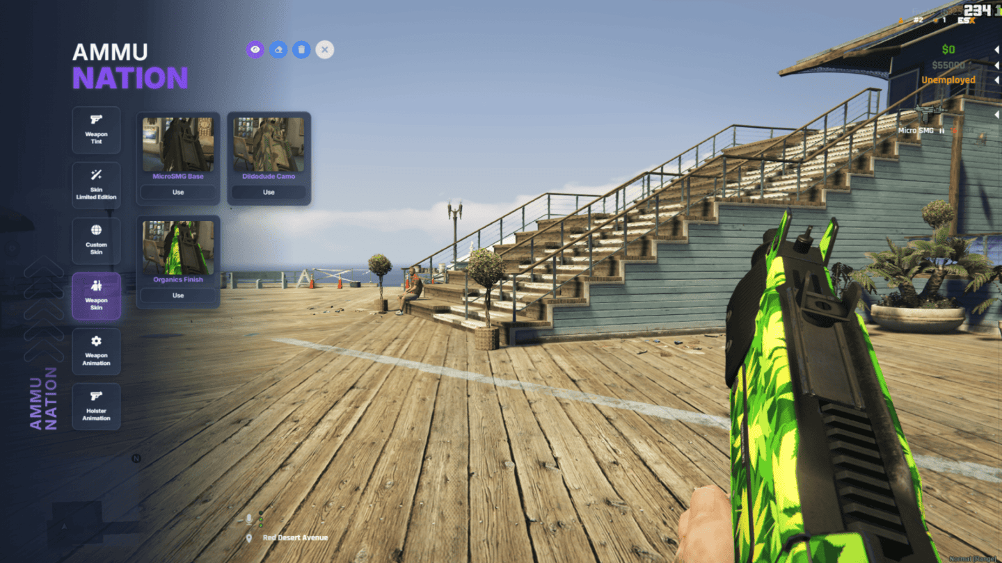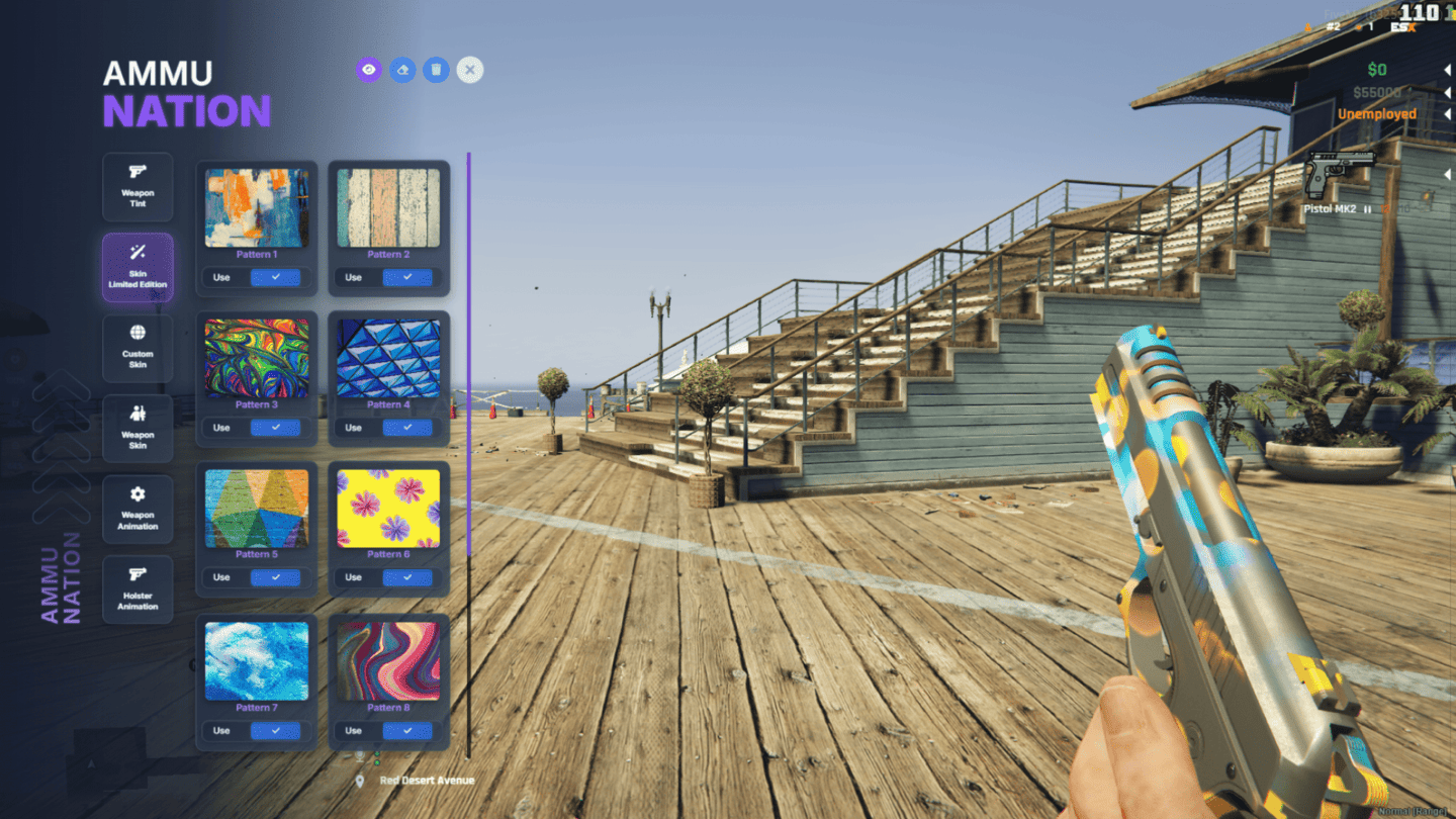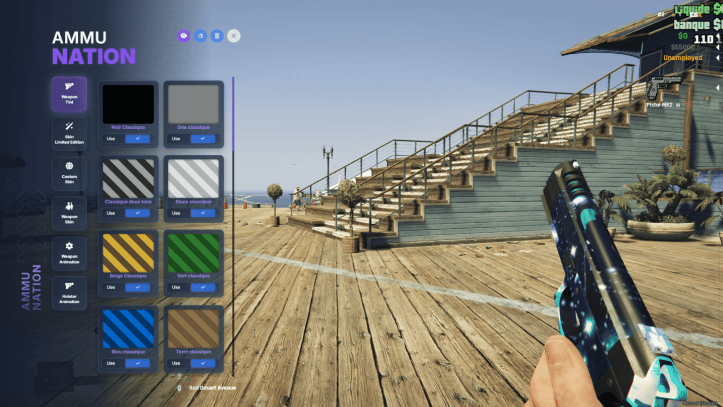 A dedicated section showcasing the native GTA/FiveM weapon skins, allowing players to apply official camouflages and finishes directly from the game. Each skin is displayed clearly with instant in-game preview for fast selection.