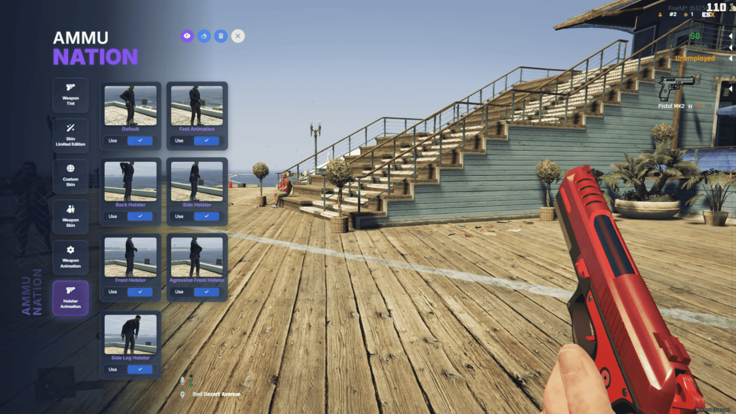 A modern holster animation menu offering several draw/holster styles. Each option is previewed clearly, allowing players to customize how their weapon is carried and equipped.