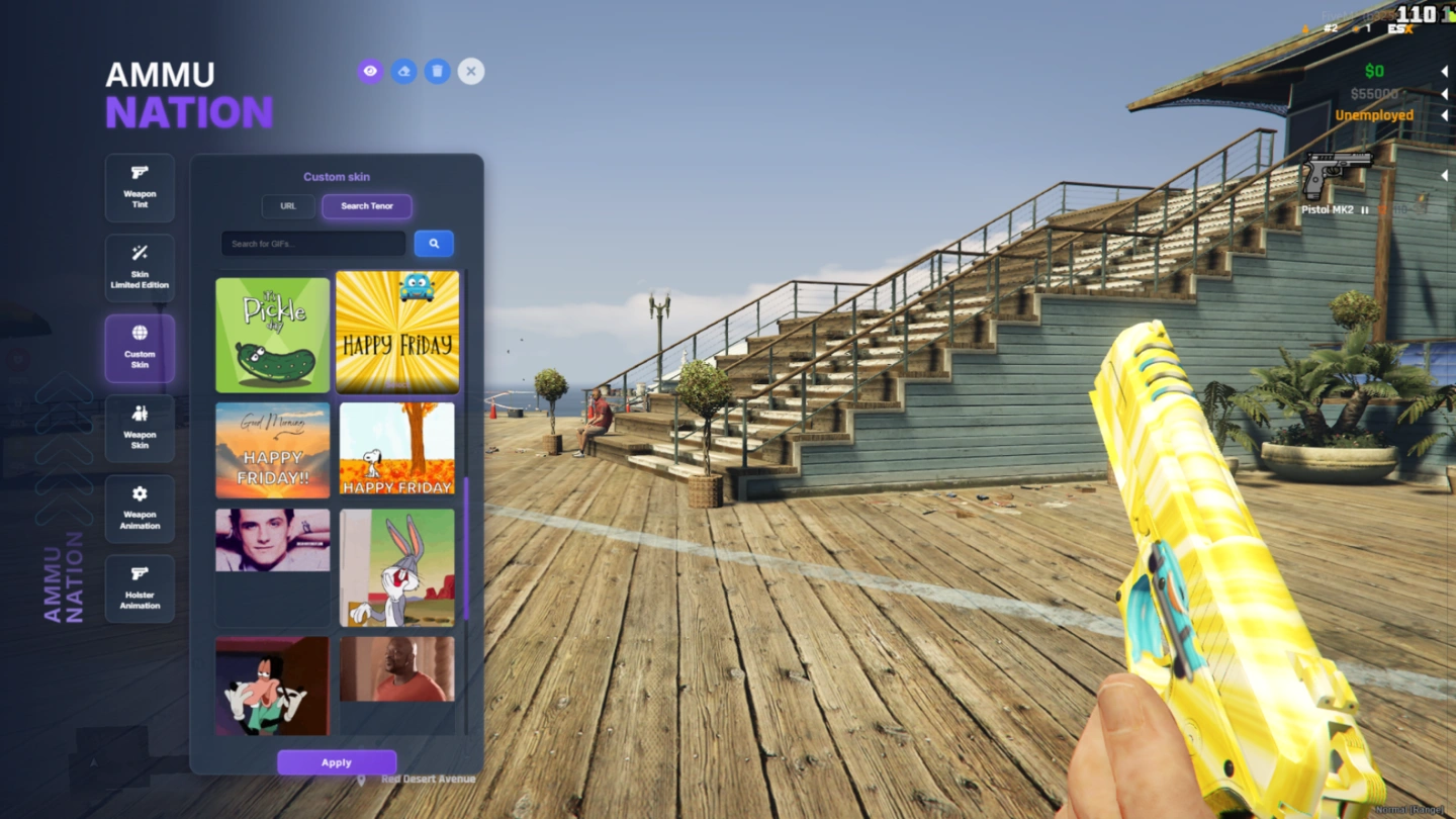 A full custom skin creator with URL input and Tenor GIF search. Players can apply any image or GIF as a weapon texture with real-time preview for unlimited personalization.